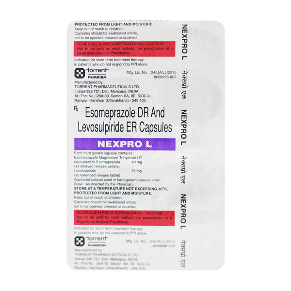 The Esomeprazole 40mg + Levosulpiride 75mg capsule is a fixed-dose combination used to treat gastroesophageal reflux disease (GERD), functional dyspepsia, acid reflux, and other related gastrointestinal motility disorders.