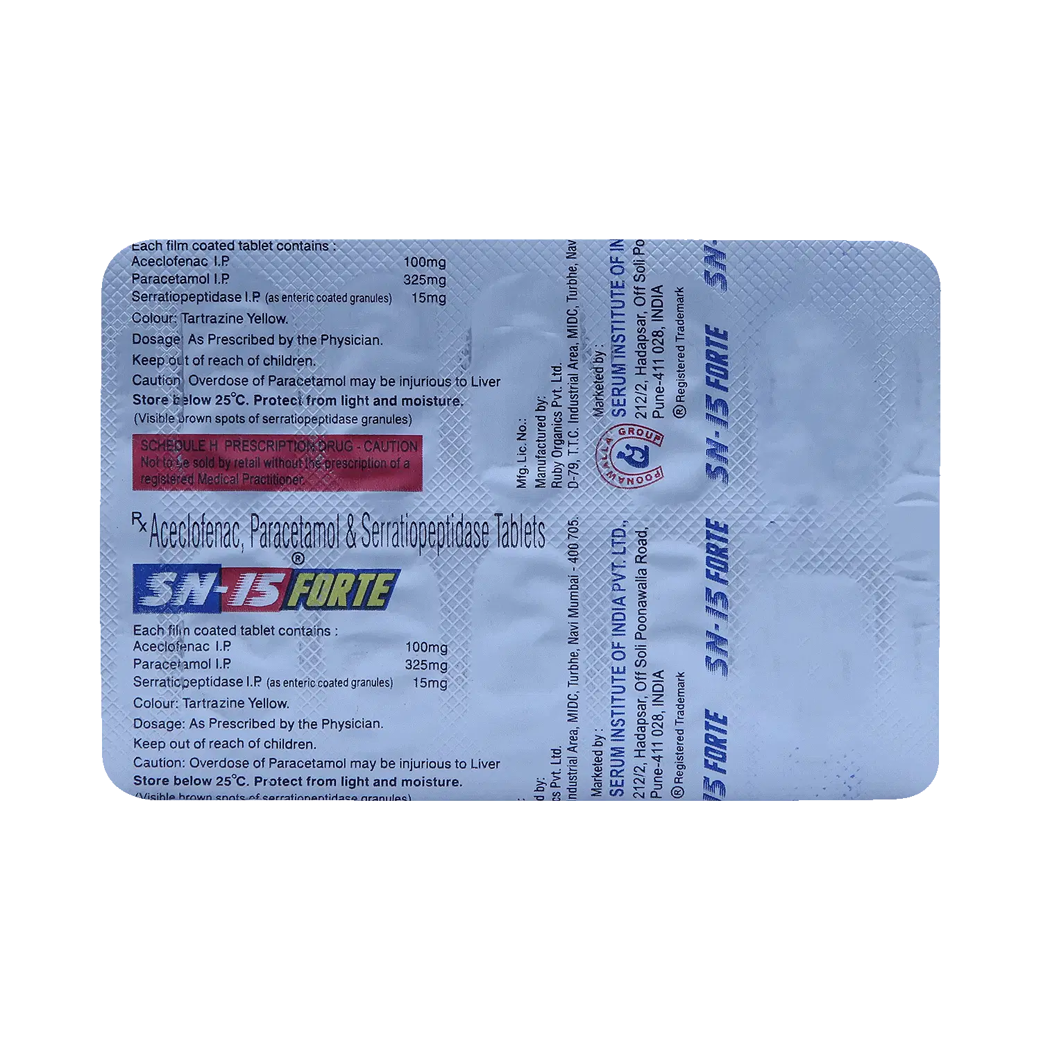 Aceclofenac 100mg + Paracetamol 325mg + Serratiopeptidase 15mg